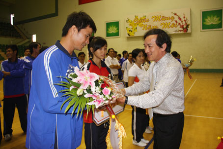 | Phó chủ tịch UBND tỉnh Nguyễn Thành Trí tặng cờ lưu niệm và hoa cho các đoàn tham dự. |