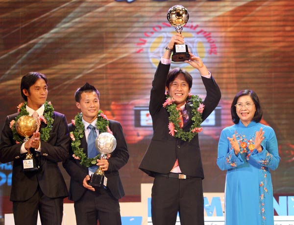 Minh Phương (phải) nhận danh hiệu Quả bóng vàng 2010 và năm nay anh vẫn có tên trong danh sách đề cử. Ảnh: Quang Nhựt