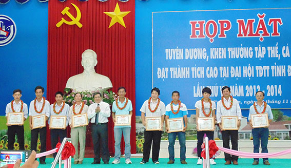 UBND huyện Trảng Bom vừa họp mặt, tuyên dương khen thưởng cho 10 tập thể, 10 cá nhân có đóng góp nhiều cho thành tích của huyện tại Đại hội TDTT tỉnh; đồng thời khen thưởng cho 25 HLV, 37 VĐV đoạt HCV, 34 VĐV đoạt HCB, 39 VĐV đoạt HCĐ tại đại hội với tổng số tiền hơn 139 triệu đồng (ảnh).