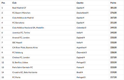 Các vị trí còn lại trong Top 10 là Barca, Atletico Nacional (Colombia), Juventus, Arsenal, Napoli, River Plate, FC Salzburg (Áo).