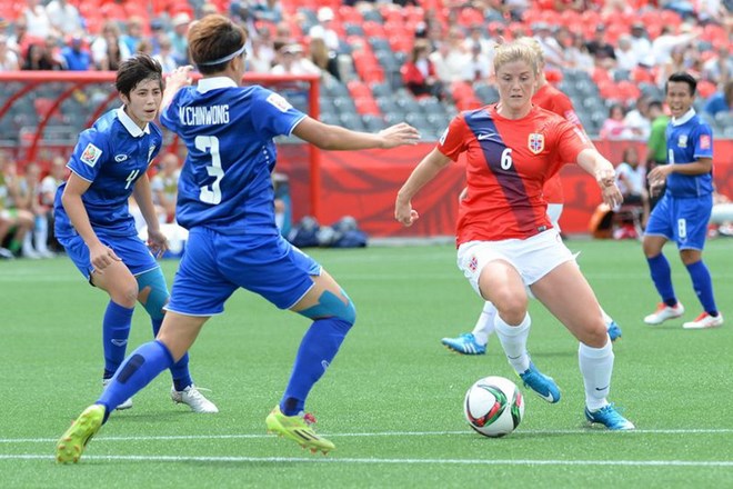 Còn ở trận đấu ra quân, dù đã nỗ lực, song Thái Lan không thể ngăn cản được Na Uy đẳng cấp hơn rất nhiều. Sau 45 phút đầu tiên, Na Uy đã dẫn trước 3-0 bởi các pha lập công của Trine Roening và Isabell Herlovsen (cú đúp).