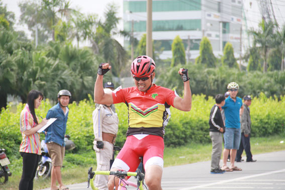 | Khoảnh khắc ăn mừng chiến thắng của tay đua Võ Thanh Phong (19, Đồng Tâm team) khi về đích đầu tiên. |
