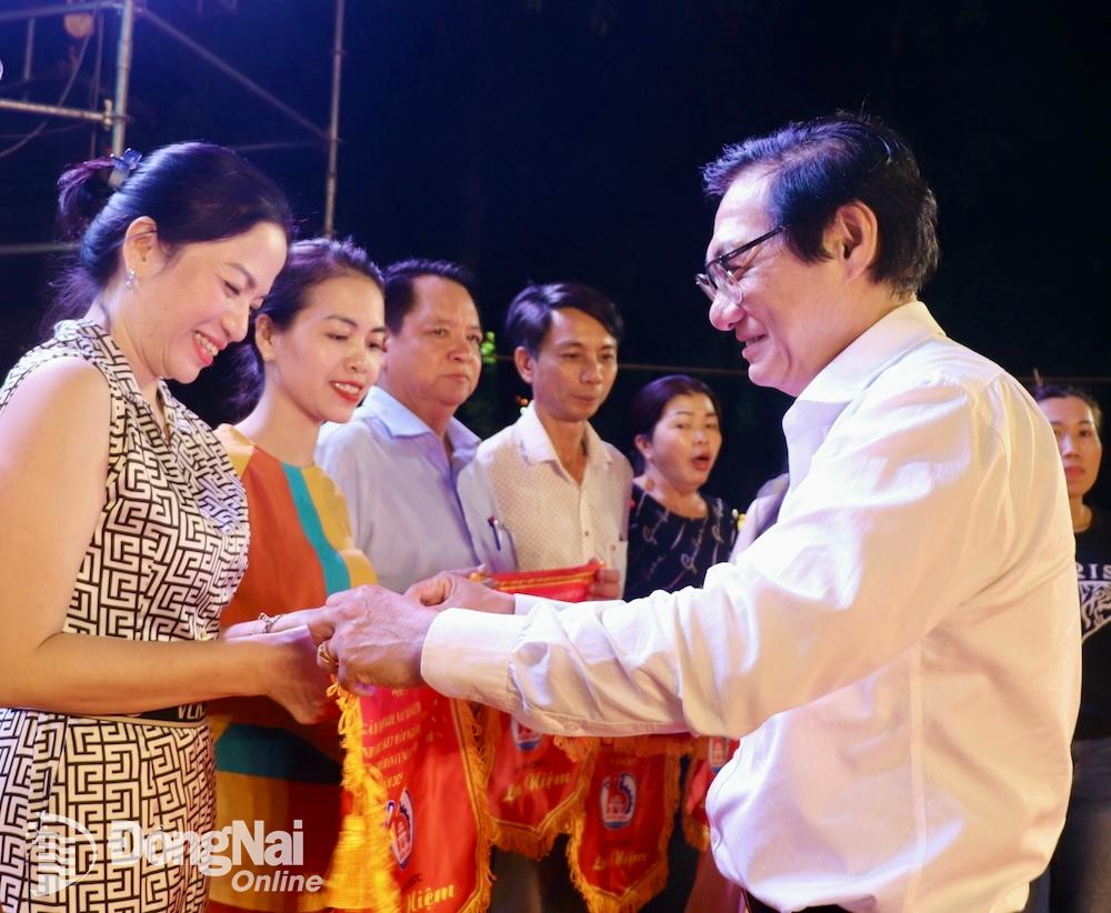 | Phó chủ tịch UBND tỉnh Nguyễn Sơn Hùng tặng cờ lưu niệm cho đại diện các đơn vị tham gia các hoạt động chào đón Tết cổ truyền Xuân Ất Tỵ do thành phố Biên Hòa tổ chức. Ảnh: Hải Yến |