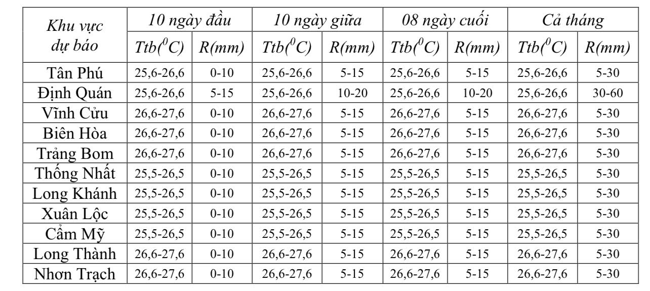 Giám đốc Đài Khí tượng thủy văn Đồng Nai Nguyễn Phước Huy lưu ý trong tháng 3 có khả năng xuất hiện các hiện tượng thời tiết nguy hiểm: lốc xoáy, gió giật, mưa với cường độ mạnh trong những cơn mưa dông. Đề phòng khả năng nhiệt độ giảm thấp vào ban đêm ở nửa đầu tháng và khả năng xuất hiện nắng nóng diện rộng vào nửa cuối tháng.