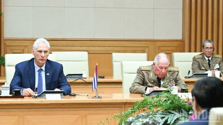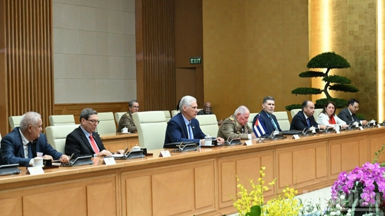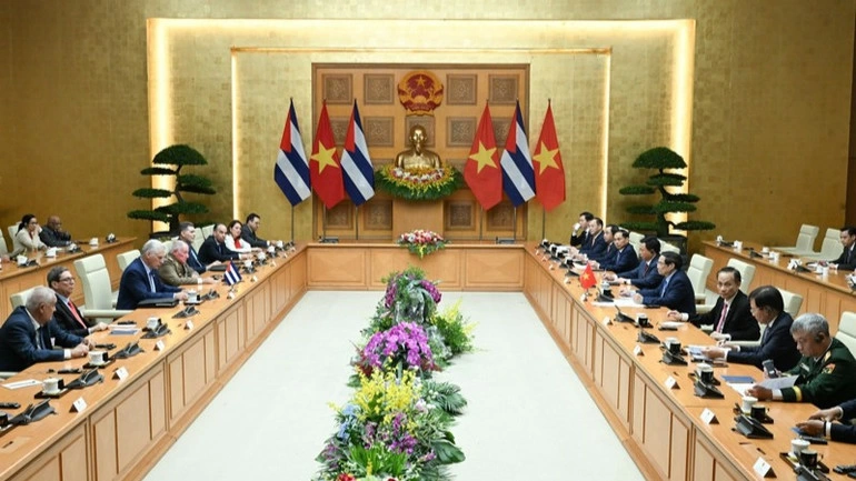 Thủ tướng Chính phủ bày tỏ vui mừng và đánh giá cao kết quả tốt đẹp đạt được tại cuộc hội đàm giữa Bí thư Thứ nhất, Chủ tịch nước Cuba với Tổng Bí thư Tô Lâm và cuộc hội kiến với Chủ tịch nước Lương Cường; nhấn mạnh việc Việt Nam luôn quan tâm theo dõi sát sao tình hình Cuba; chia sẻ những khó khăn, thách thức Cuba đang phải đối mặt; tin tưởng chắc chắn rằng dưới sự lãnh đạo sáng suốt của Đảng Cộng sản Cuba, đất nước Cuba anh em sẽ tiếp tục bảo vệ vững chắc thành quả Cách mạng, giành được những thắng lợi mới trong sự nghiệp xây dựng và phát triển đất nước.