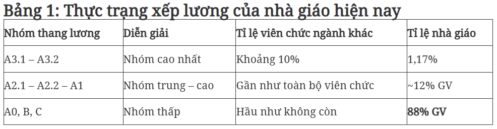 Những con số này cho thấy mặc dù chủ trương "lương nhà giáo cao nhất" được đề ra từ năm 1996, nhưng đến nay việc xếp lương thực tế chưa phản ánh đúng tinh thần đó. Trong khi đó, nhà giáo là lực lượng lao động đặc biệt - cần kiến thức chuyên môn sâu, kỹ năng sư phạm, phẩm chất đạo đức, sự bền bỉ, và có trách nhiệm tạo ra nguồn nhân lực cho tương lai đất nước.