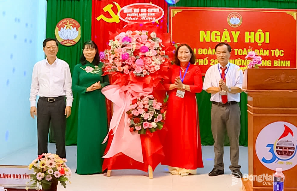 | Tỉnh ủy viên, Phó Chủ nhiệm Ủy ban Kiểm tra Tỉnh ủy Đồng Nai Lê Việt Hùng (bìa trái) cùng lãnh đạo Đảng ủy phường Long Bình tặng hoa chúc mừng Ngày hội Đại đoàn kết toàn dân tộc khu phố 26. Ảnh: Quang Phát |