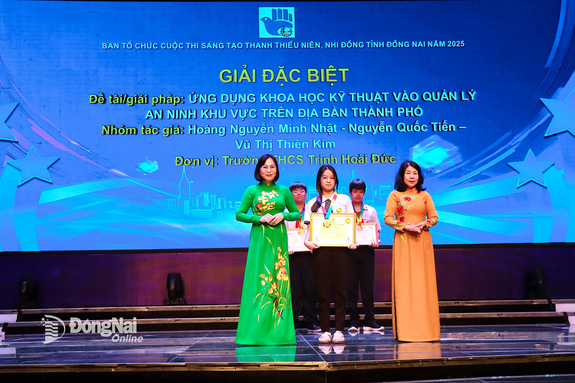 | Tỉnh ủy viên, Phó Chủ tịch UBND tỉnh Đồng Nai Nguyễn Thị Hoàng và Chủ tịch Liên hiệp các Hội Khoa học và kỹ thuật tỉnh Hoàng Thị Bích Hằng trao giải cho tác giả đoạt giải đặc biệt Cuộc thi Sáng tạo thanh thiếu niên, nhi đồng tỉnh Đồng Nai năm 2025. Ảnh: Hải Yến |