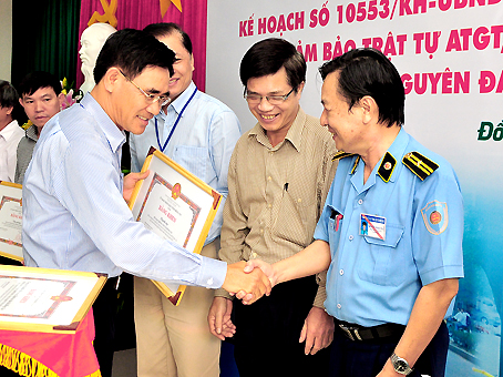 Phó chủ tịch UBND tỉnh Trần Văn Vĩnh trao bằng khen cho 6 tập thể có thành tích trong việc đảm bảo trật tự an toàn giao thông dịp Tết 2014. Ảnh: Đ.Tùng |