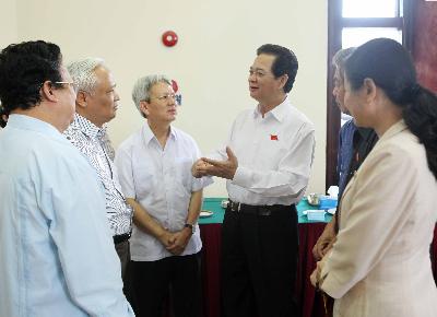 | Thủ tướng Nguyễn Tấn Dũng trao đổi với các đại biểu Quốc hội trong giờ giải lao |