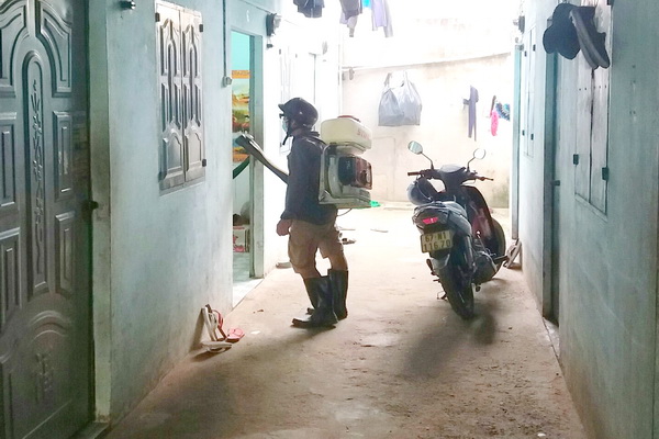 | Cộng tác viên y tế phun hóa chất diệt muỗi tại một khu nhà trọ ở xã Phước Thiền, huyện Nhơn Trạch. |