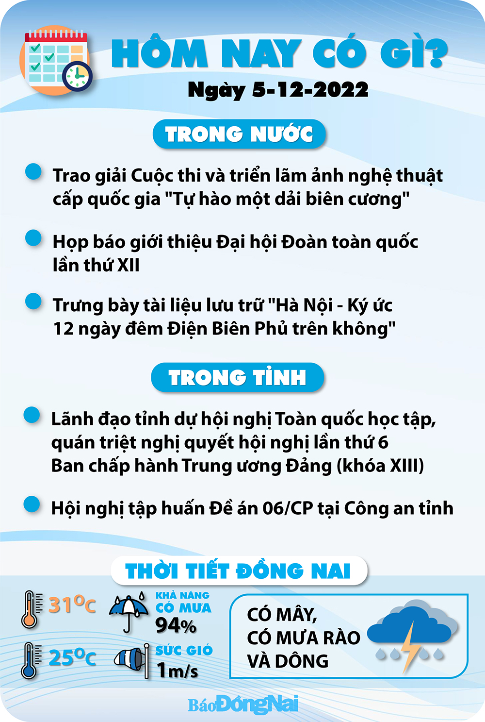 Hôm nay, ngày 5-12, sẽ diễn ra các sự kiện chính trị, kinh tế, xã hội quan trọng. Trong đó, có lễ trao giải Cuộc thi và triển lãm ảnh nghệ thuật cấp quốc gia "Tự hào một dải biên cương"; Họp báo giới thiệu Đại hội Đoàn toàn quốc lần thứ XII; Trưng bày tài liệu lưu trữ "Hà Nội - Ký ức 12 ngày đêm Điện Biên Phủ trên không"…