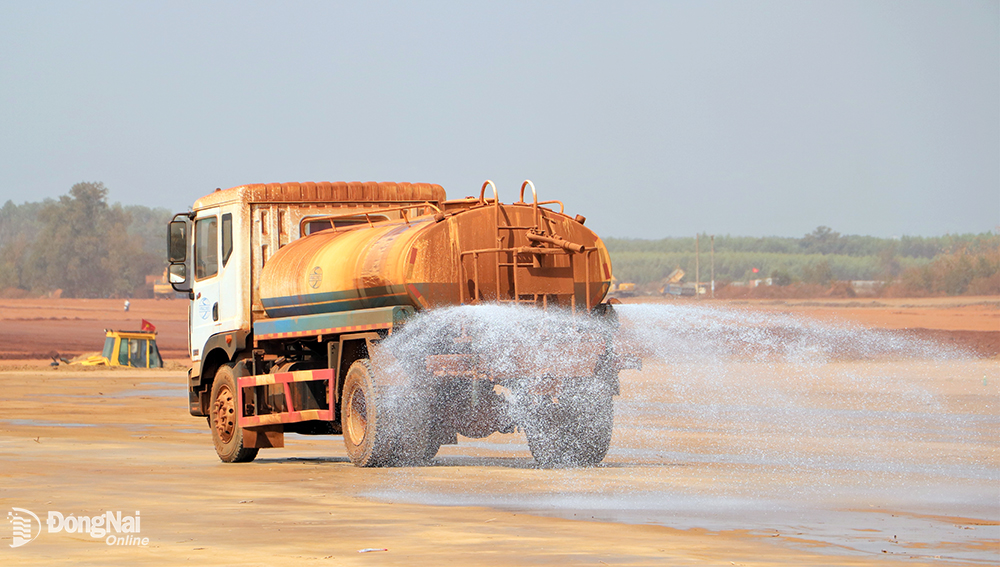 | Để giảm thiểu lượng bụi phát sinh trong quá trình thi công, thời gian qua, các nhà thầu đã tăng cường huy động các xe bồn tưới nước trên công trường dự án |