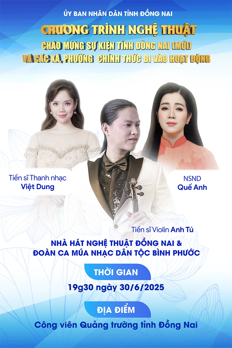 (ĐN)- Chương trình nghệ thuật chào mừng sự kiện tỉnh Đồng Nai mới và các xã, phường chính thức đi vào hoạt động có sự tham gia của các nghệ sĩ âm nhạc lớn.