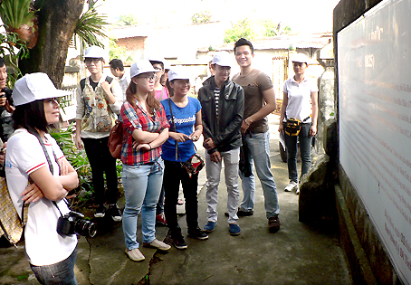 | Di tích cấp quốc gia mộ Trịnh Hoài Đức rất hiếm khi có khách đến tham quan. Trong ảnh: Một nhóm bạn trẻ đến tham quan khu mộ. |