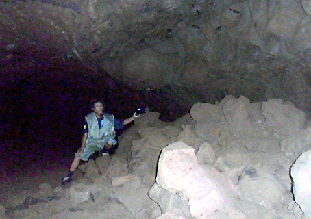| Thành hang bằng đá và rất thấp và phía sau là những đống đất đá từ thành hang sụp lún xuống chắn cả lối đi. |