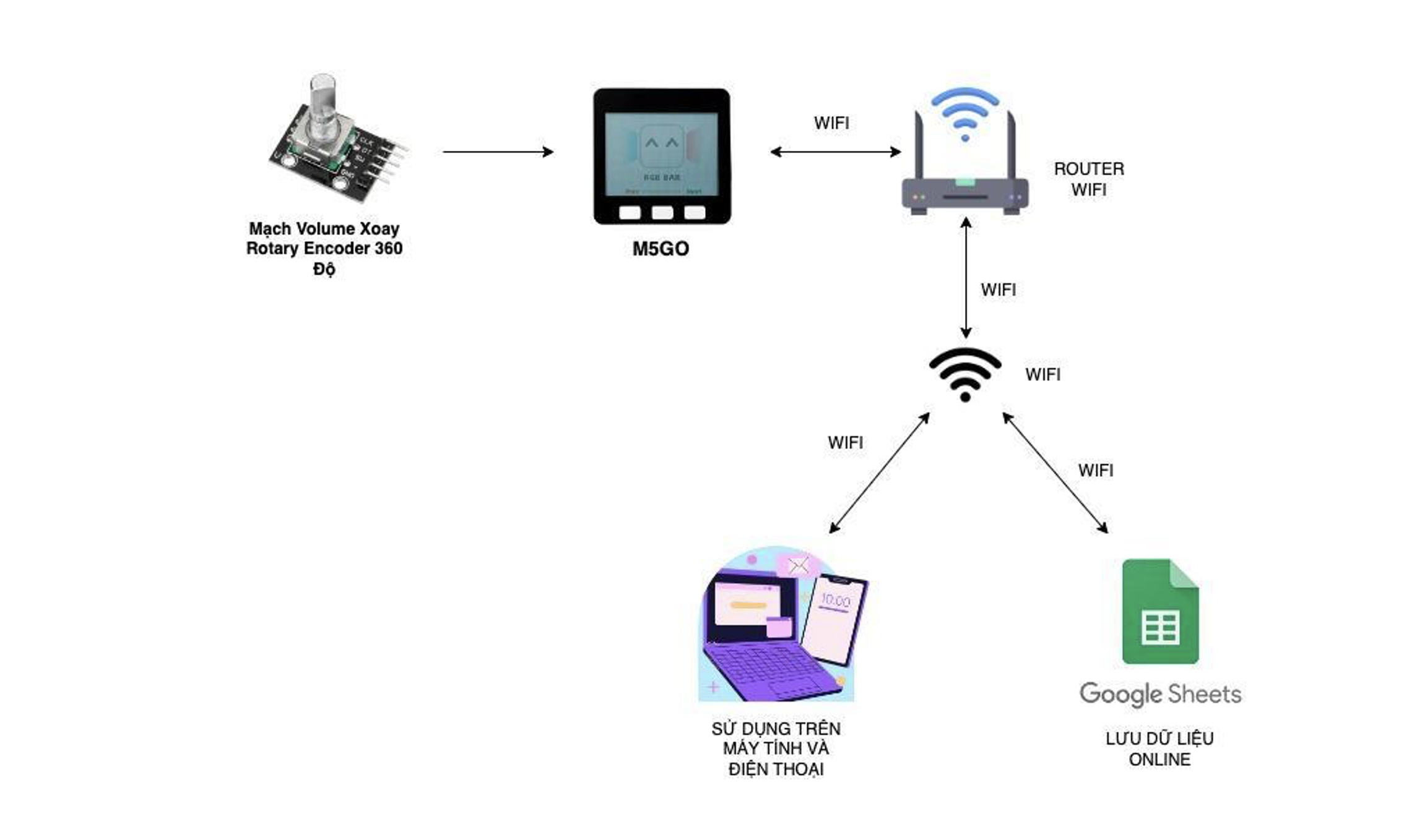 Về tiến trình, người dùng sử dụng Smart jump rope thiết lập các cài đặt trên thiết bị và bắt đầu tập luyện. Trong quá trình luyện tập, cảm biến thu thập dữ liệu về chuyển động của dây nhảy. Bộ xử lý trung tâm M5Go xử lý dữ liệu từ cảm biến, tính toán thông số tập luyện: số vòng nhảy, tốc độ nhảy, calo tiêu thụ… Khi đó, thông tin tập luyện hiển thị trên màn hình LCD, Google Sheet và web trên điện thoại hoặc máy tính.