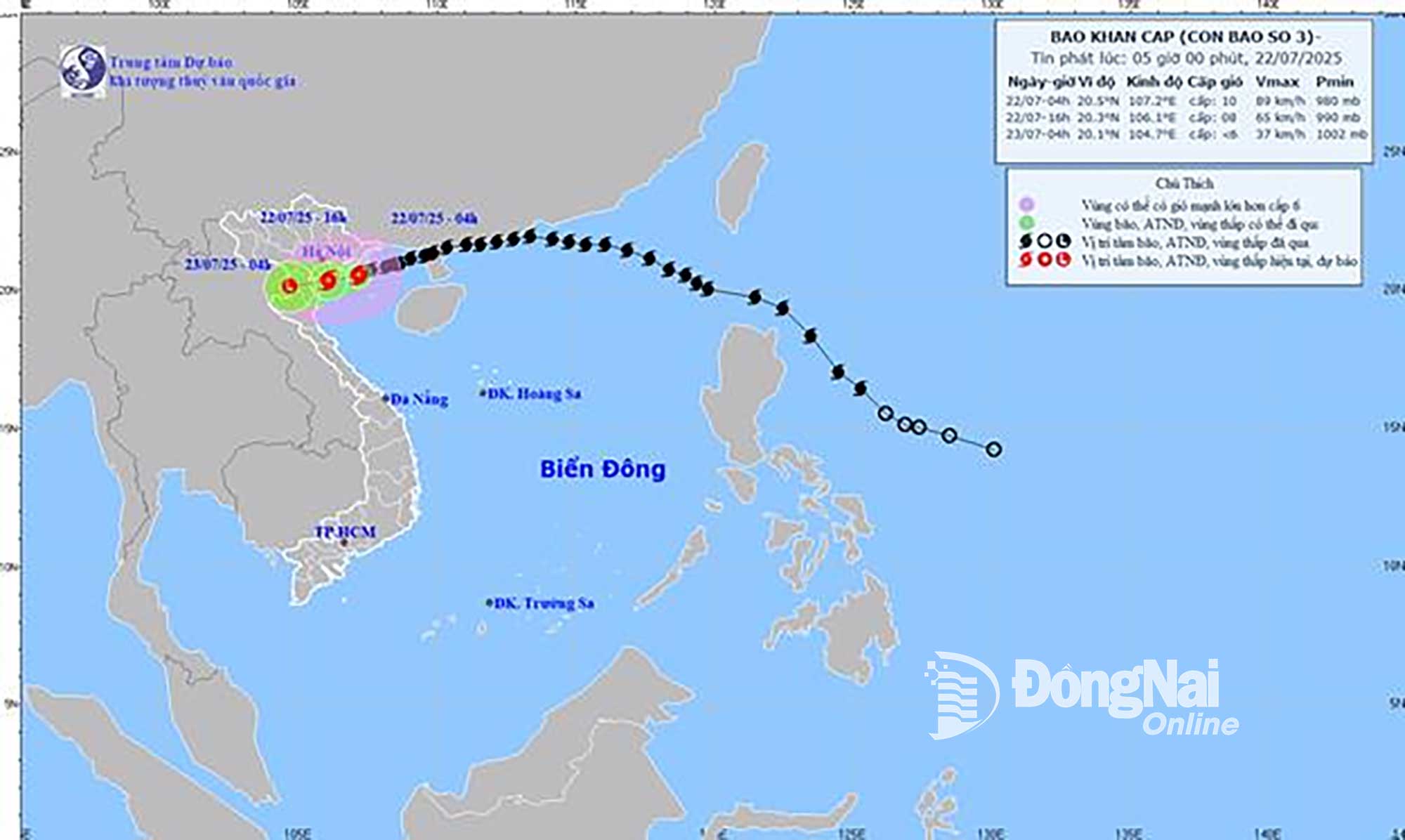 (ĐN) - Sáng 22-7, Đài Khí tượng thủy văn Đồng Nai cho biết, vào lúc 7 giờ sáng ngày 22-7, vị trí tâm bão số 3 (Wipha) khoảng 20,2 độ vĩ Bắc; 106,7 độ kinh Đông, cách Quảng Ninh khoảng 202km về phía Nam Tây Nam, cách Hải Phòng khoảng 67km về phía Đông Nam, cách Hưng Yên khoảng 25km về phía Đông, cách Ninh Bình khoảng 45km về phía Đông Bắc.