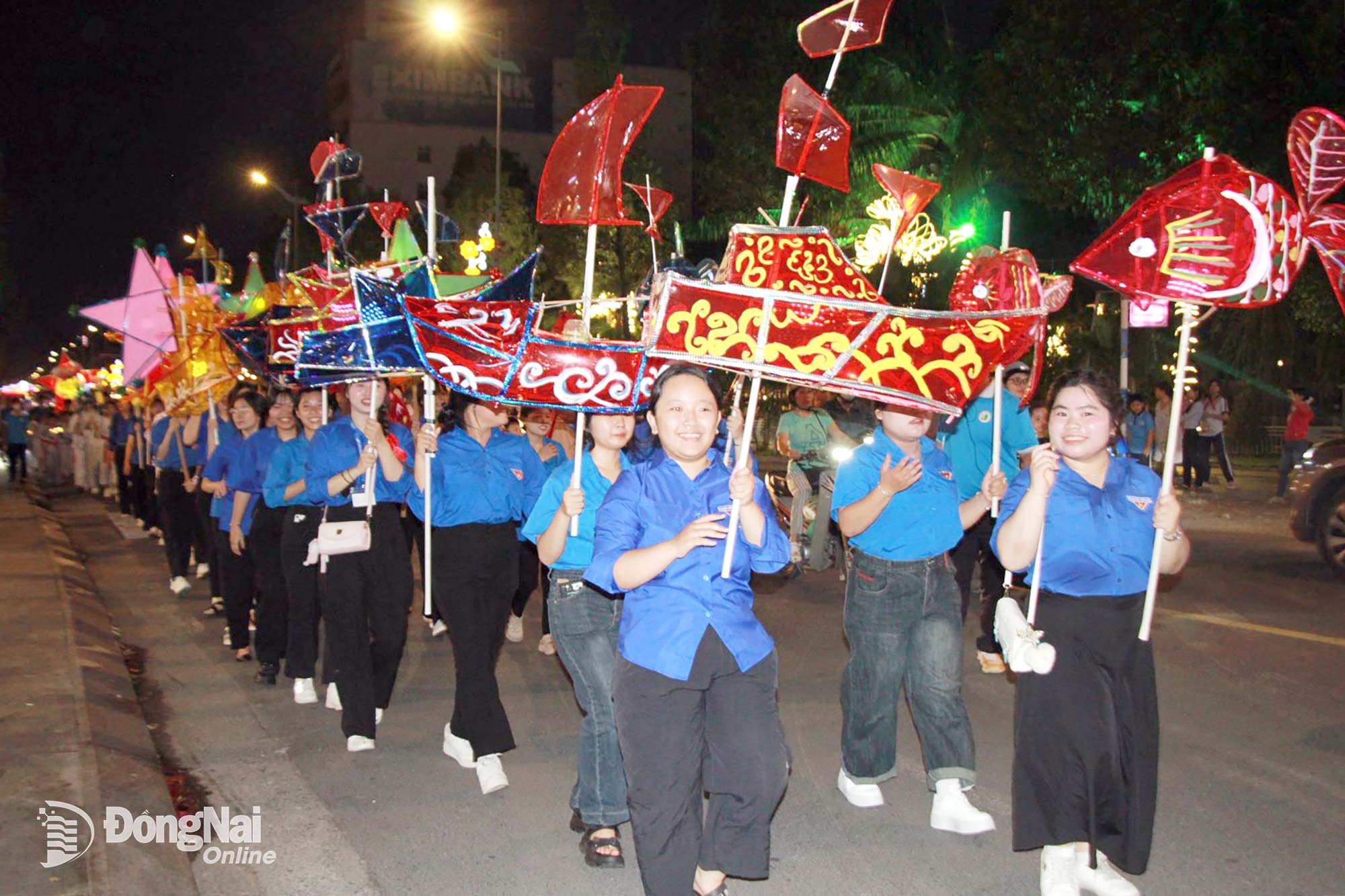 | Đoàn viên, thanh thiếu nhi tham gia rước đèn trên một số tuyến đường ở phường Trấn Biên. Ảnh: Nga Sơn |