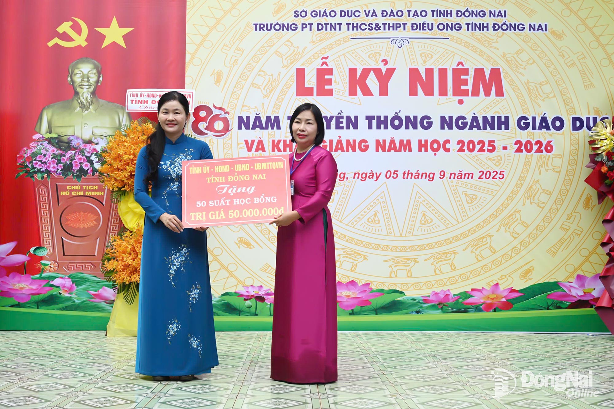 | Thay mặt Tỉnh ủy - HĐND - UBND - Ủy ban MTTQ Việt Nam tỉnh Đồng Nai, Ủy viên dự khuyết Trung ương Đảng, Phó Bí thư Thường trực Tỉnh ủy, Chủ tịch HĐND tỉnh Đồng Nai Tôn Ngọc Hạnh trao tặng trường 50 suất học bổng trị giá 50 triệu đồng. Ảnh: Ngọc Thảo |