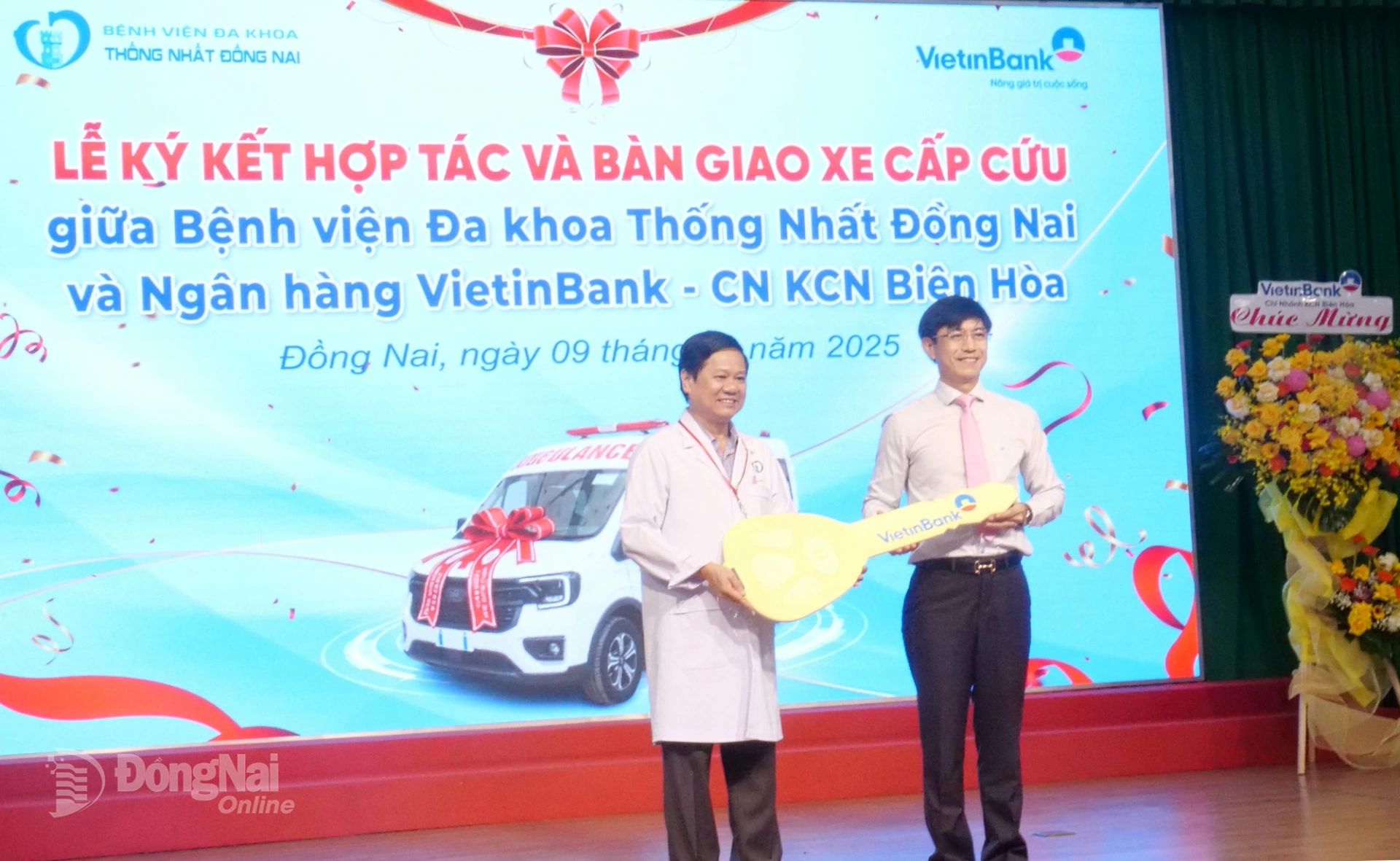| Lãnh đạo Ngân hàng Vietinbank chi nhánh Biên Hòa trao biểu trưng chìa khóa xe cứu thương cho lãnh đạo Bệnh viện Đa khoa Thống Nhất. Ảnh: Hạnh Dung |
