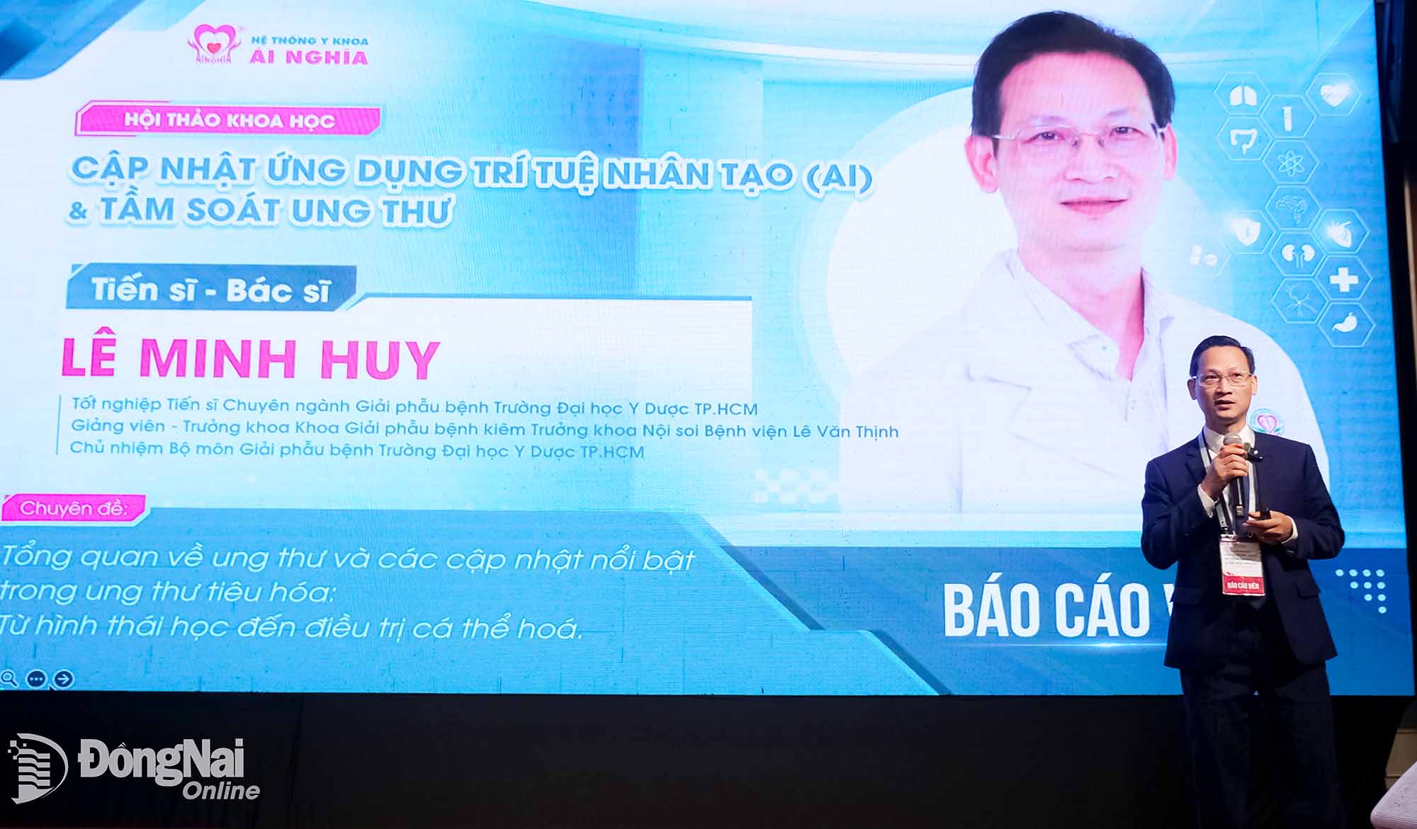 | TS-BS Lê Minh Huy, Chủ tịch Hội Giải phẫu bệnh Thành phố Hồ Chí Minh báo cáo đề tài nghiên cứu khoa học tại hội thảo. Ảnh: Hạnh Dung |