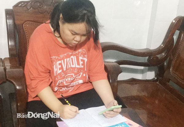 | Em Trần Bảo Ngọc đang học trực tuyến tại nhà. Ảnh: C.Nghĩa |